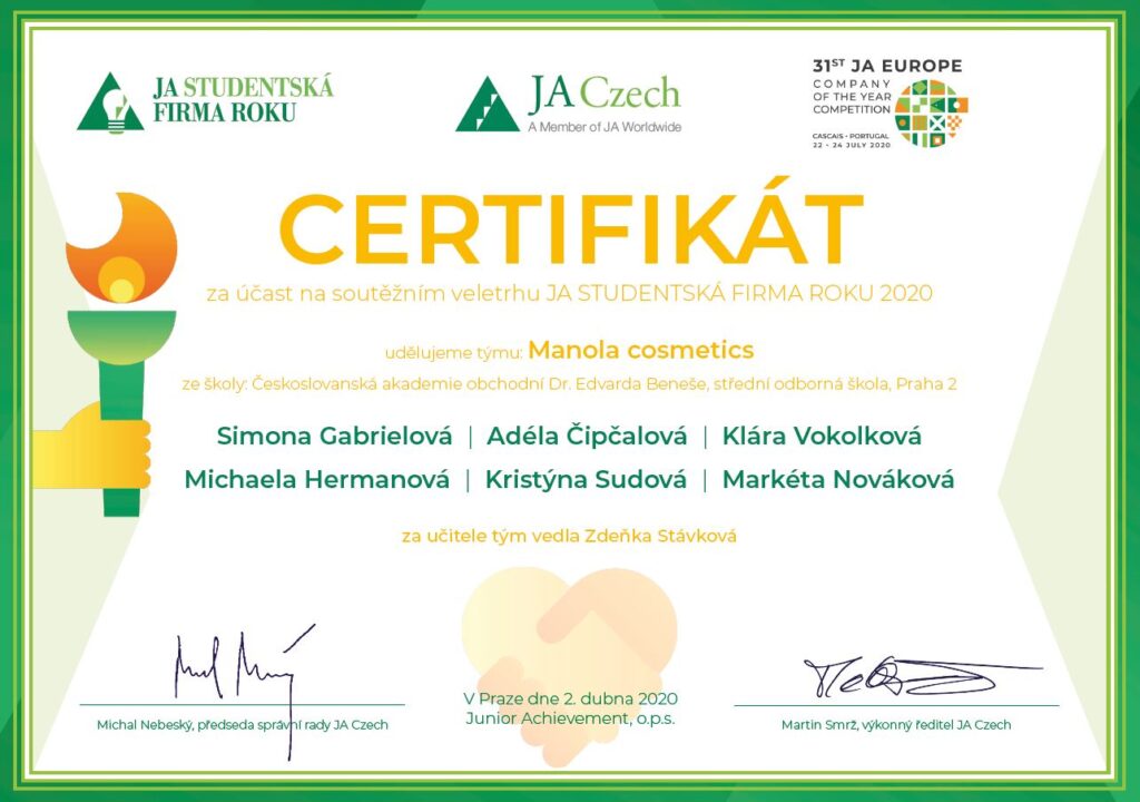 Náš tým Manola cosmetics, ve složení Simona Gabrielová, Adéla Čipčalová, Klára Vokolková, Michaela Hermanová, Kristýna Sudová a Markéta Nováková, se probojoval mezi 10 nejlepších JA studentských firem roku 2020. Máme radost a gratulujeme!