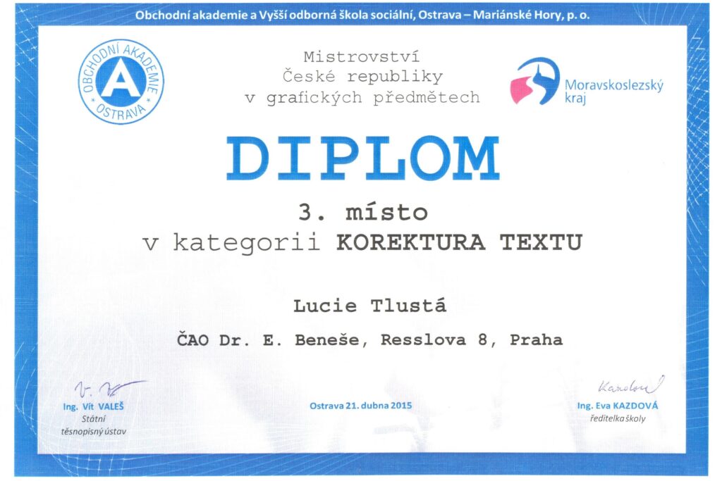 Na Mistrovství republiky v grafických disciplínách 21. dubna 2015 byly letos do Ostravy nominovány dvě naše žákyně. V korektuře textu soutěžila již zkušená závodnice Lucie Tlustá z 4. B, které se podařil její dosud nejlepší výkon 156 korektur, a tím obsadila a z předchozích dvou let obhájila 3. místo. Tandem doplňovala Markéta Fousková z 2. A, která začala trénovat poměrně nedávno, přesto se jí povedl osobní rekord 80 korektur, čímž obsadila 15 místo.
