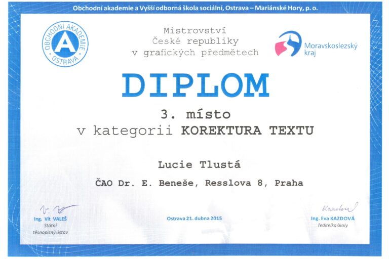 Na Mistrovství republiky v grafických disciplínách 21. dubna 2015 byly letos do Ostravy nominovány dvě naše žákyně. V korektuře textu soutěžila již zkušená závodnice Lucie ...